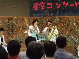 | 18:30ごろからは、一転してエレガントな金管五重奏。 前半はCDにも収録されている「テ・デウム」前奏曲から。 続いて「モンテレジャンの丘」そして「カルメンファンタジー」と題したビゼーの組曲「カルメン」からのメドレー演奏と、クラシックやブラスの為の曲で構成されていました。 休憩の後の後半は衣装もアクティブな印象に変わり、映画「ロッキー」のテーマで幕を開けとなり、前半とは雰囲気が変わりました。 星空コンサートにちなんで、「スターダスト」や「見上げてごらん夜の星を」などポピュラーな曲が中心となりました。 「童謡メドレー」では、チューバのベルとトランペットのベルを合わせ、チューバのシリンダーを動かすことでトレモロのような効果をだしての演奏、「赤とんぼ」は郷愁のある響きで、心に響きました。 また楽器紹介のコーナーでは、ホルンの特徴についてお話しがあり、その知られざる秘密(?)に会場一同が「ほぉ〜!」感心するような場面もありました。 ホルンは狩の時の合図に使われ、右手で馬の手綱を持つことから、左手でロータリーの操作をし、後方に仲間に合図をする為、ベルが後ろ向きになる と言うことでした。 「ユー・アー・マイ・サンシャイン」の演奏では、お客さんたちの手拍子を交え、会場が一体となりました。 金管楽器と言うことで、煌びやかな音を想像していましたが、とても柔らかな音色もあり、そして5人の息がピッタリ合った調和された音色に魅了されました。 質の高い音楽を、こうして間近で聴けるこのコンサート、聴きに来られた皆さんも、きっと満足されたのではないでしょうか。 会場の雰囲気もよく、素晴らしいコンサートだったと思います。 |