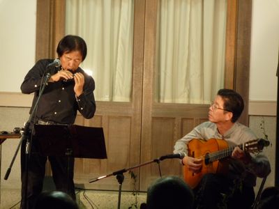 | 第二部では友情出演されたギタリストの高橋さんとの共演で、モンティの「チャールダッシュ」を聴かせて頂きました。 前半のゆったりした部分、中間部の速いパッセージの部分、エンディングの部分と3種類のオカリナを駆使しての演奏、ギターとの息もぴったりで、お二人のアンサンブルは圧巻でした。 会場からも一層の大きな拍手で称えられているように感じました。 |