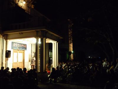 開演の18:30には、辺りはすっかり暗くなり、ライトアップされた舞台と、資料館東側の塔がきれいに浮かび上がっていました。 そして、秋の虫たちの声が響く中、オカリナの素朴な音色が響き始め、第24回星空コンサートがスタートしました。 今年は天候にも恵まれ、開始直後は昼間の熱が残っていたようで、若干の蒸し暑さも感じられましたが、次第に秋の空気に包まれていき、心地良い気候の中、上質な音楽を皆さんリラックスされた様子で、聴かれているようでした。 |