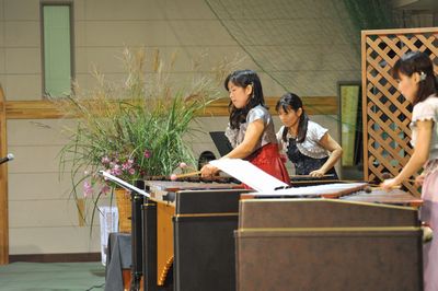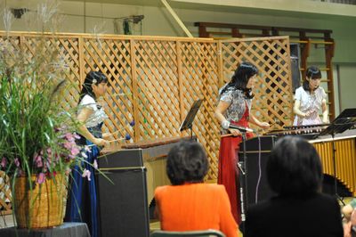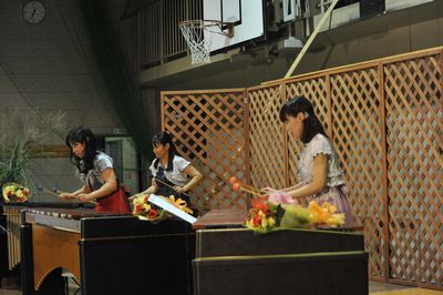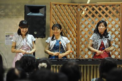 | ジュテームさんは、いろんなジャンルの曲を3台のマリンバで演奏され、会場は温かい音色で包み込まれました。。 〜 マリンバトリオ・ジュテーム 〜 (写真左から) ★桂山たかみさん ★菊池有花さん ★藤井聖子さん |