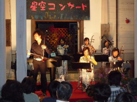 第33回 平成30年(2018年)9月29日 土曜日 二胡奏者の出會みゆきさんにお願いして、パーカッションやピアノを含めたアンサンブル形式で演奏していただきました。 出會さんは委員会メンバーからの紹介でした。 私は演奏をお聴きしたことがなかったので、自己紹介もかねて演奏会にもお邪魔させて頂きました。 この時はピアノとのデュオでしたが、中胡や高胡という楽器もあって、二胡を含めて「胡琴」ということを、初めて知りました。 星空コンサートでも中胡や高胡も演奏していただき、いろいろな音色が聴けて、楽しいコンサートになったと思います。 この日、大型の台風24号が接近していて、コンサート実施が危ぶまれましたが、無事に開催出来、ほんとうに良かったと思います。 |