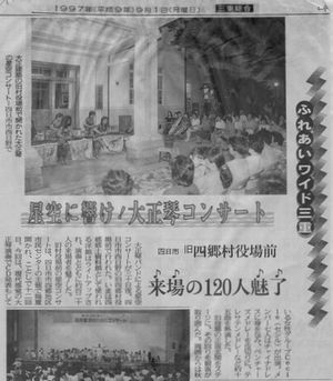 第11回(1996年)では、主催が四郷地区市民センター、後援が四郷郷土資料館運営委員会に変わり、このスタイルは第13回まで続きました。 第12回で実施されたコンサートが中日新聞で紹介されていたようです。画像のクリックで拡大ページを表示します。 → 第18回以降は9〜10月に開催されるようになり、今につながっています。蝉時雨の中のコンサート、秋の虫たちの合唱付きコンサート、どちらも季節感をたっぷり感じられます。