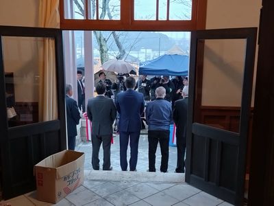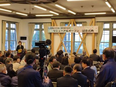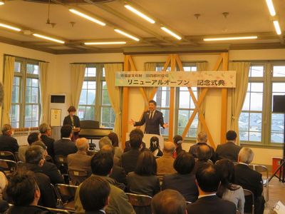 | 耐震工事で利用可能となった2階のホールでの記念式典。 森市長の挨拶や四郷小学校の生徒さんの作文発表などが あり、その音声は前庭で一般公開を待つ皆さんにも聞こえ るよう、スピーカも設置されました。 |