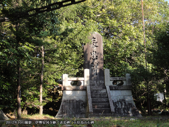 安国寺跡に入っていくと一番目立つ石碑 表忠碑があります。そのもっと奥にあり、安国寺跡の石碑から見えるのが五位鳥山の石碑です。安国寺跡の裏手にまわったほうが 石碑のある場所がはっきりと確認できます。