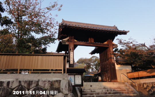 この門は、冠木/かぶき門の上に切妻屋根をかけ、背後の控え柱との間にも切妻屋根を直行してかけたいわゆる高麗門/こうらいもんである。